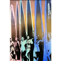 6 Vintage Surfer Girls Line Up Circa 1940's. Classic multi color silkscreen image of five vintage surfer girls laying on their surfboards. Pink, Mint Green, Royal Blue acrylic paint. Handpulled silkscreen over acrylic paint on Birch wood panel. Original, signed by the artist. Dimensions: 2" x 20" x 30"