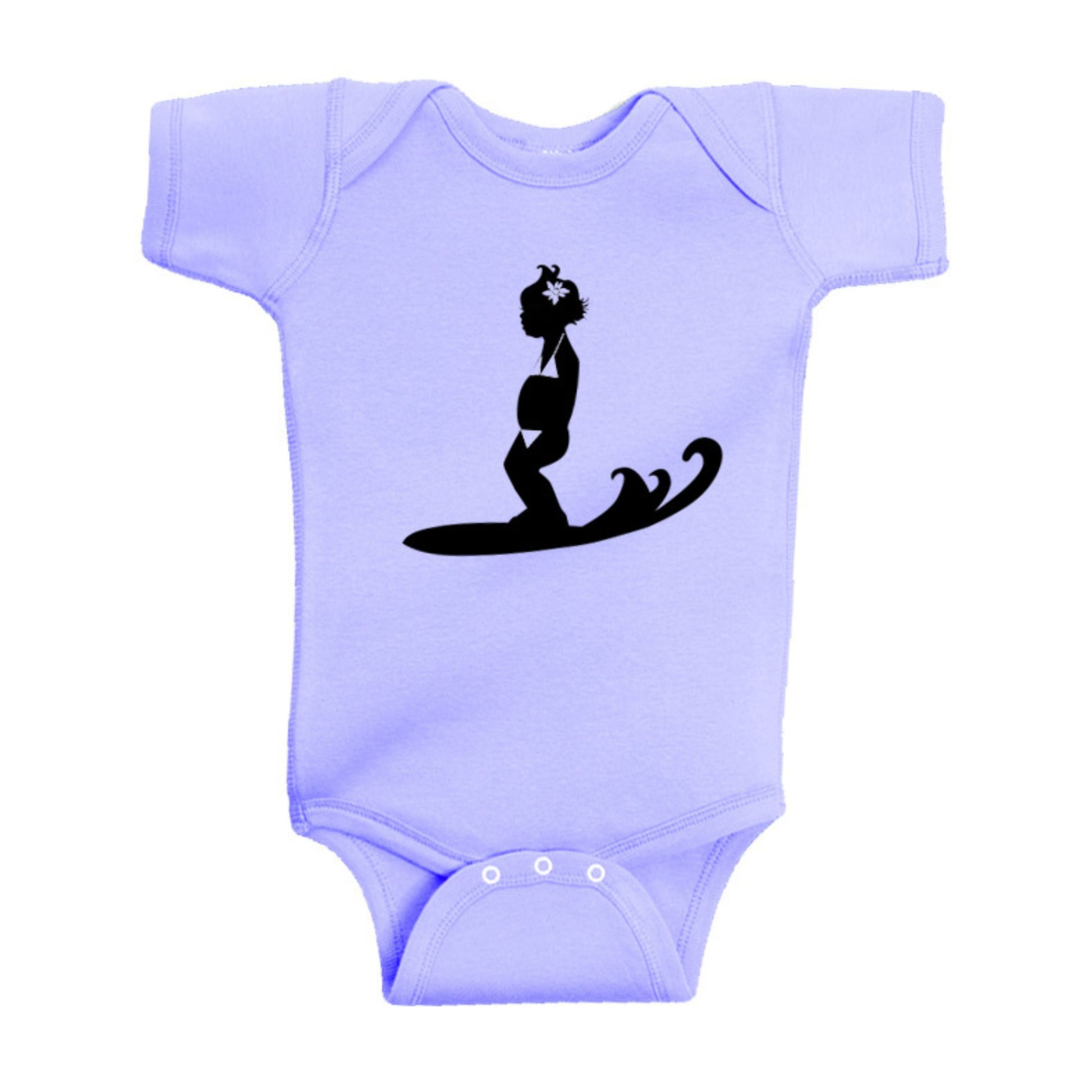 lavender-colored onesie, silk-screened with a cool graphic of a baby girl surfing in the curl.