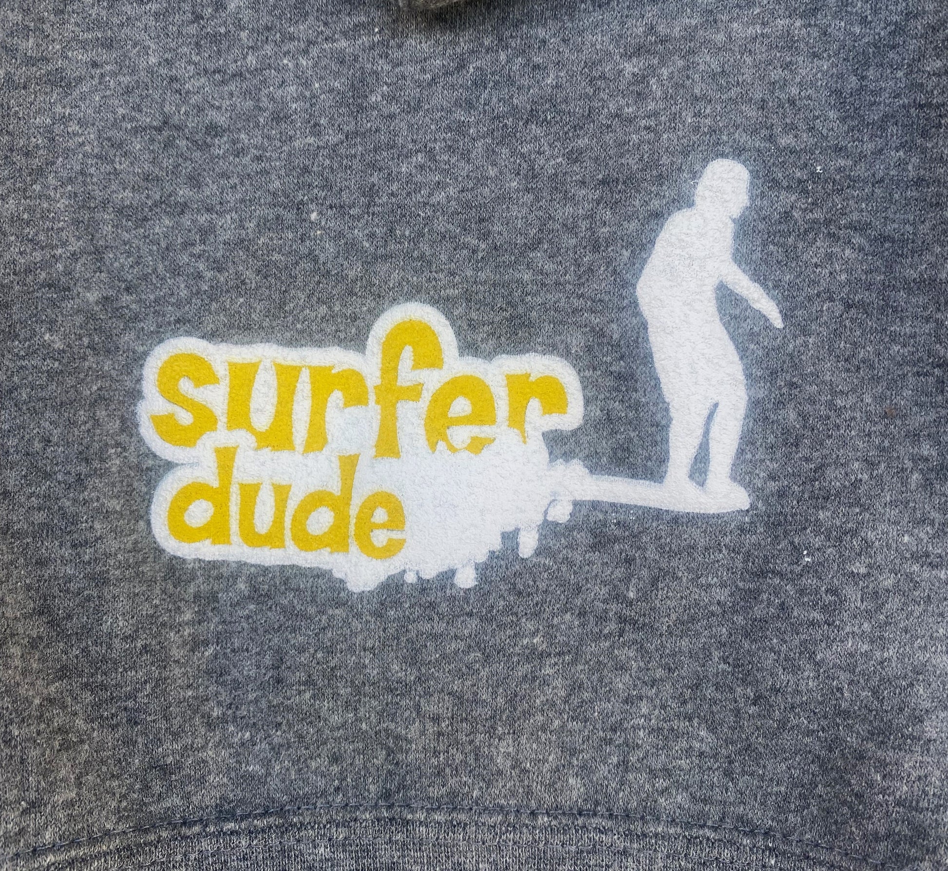 Features the Surfer dude design on the back and the Surfer Baby surfboard logo on the front chest.